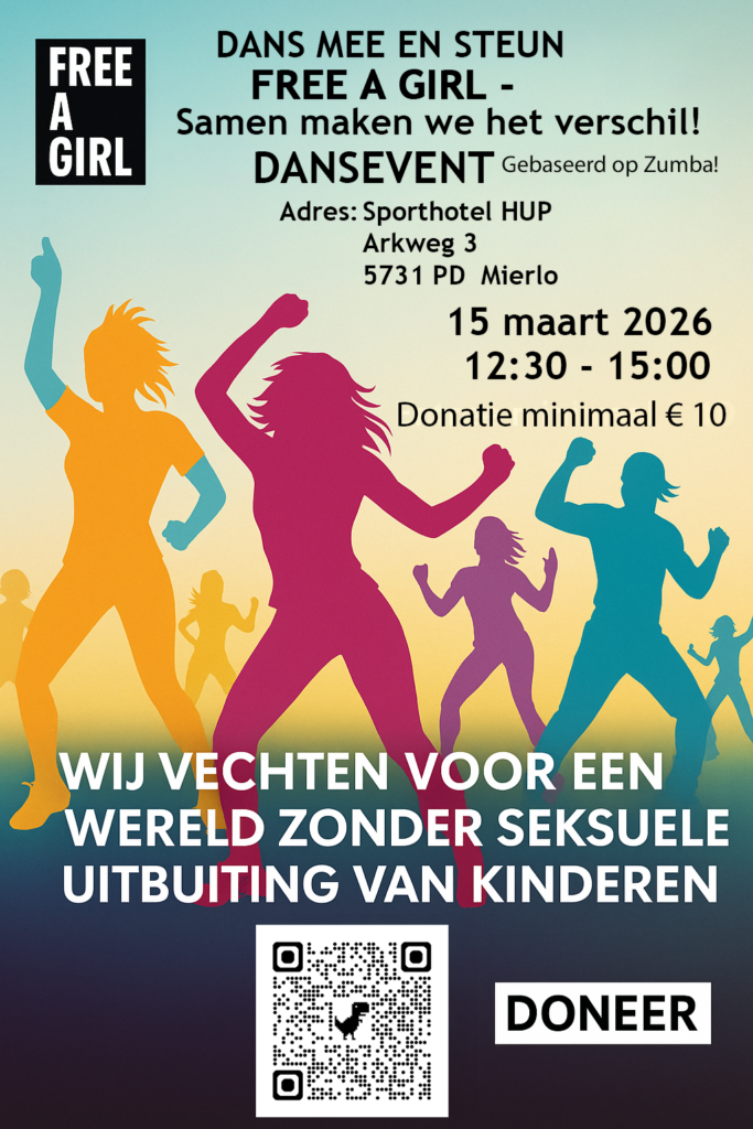 Op zondag 15 maart 2026 vindt bij Sporthotel De Hup in Mierlo een energiek Zumba-dansevent (gebaseerd op Zumba) plaats ten bate van Free a Girl. Met dit sportieve evenement willen de organisatoren geld inzamelen en aandacht vragen voor de strijd tegen seksuele uitbuiting van kinderen.